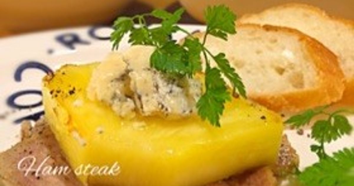 「ハムステーキにパイナップルとチーズ」の作り方。ハムステーキにパイナップルとブルーチーズを乗せてワインに合うメインディシュに♡ 材料: 手作りハム、生パイナップル、ブルーチーズ